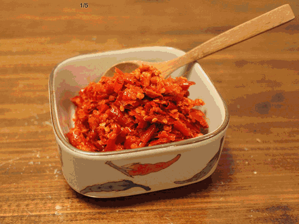 柴火胡辣椒常按比例搭配不同品種——用辣度較高的辣椒調(diào)節(jié)辣度,用燈籠椒增香,經(jīng)柴火焙烤、搓碎、人工捶細而成。每一粒辣椒碎里,都裹著柴火的煙火氣。它是蘸水的“定海神針”,拌涼菜時撒一勺,香得直鉆鼻腔;火鍋蘸料里加一點,讓醇厚中多了層爽朗的辣。這份來自傳統(tǒng)工藝的饋贈,吃的是辣,品的是時光。